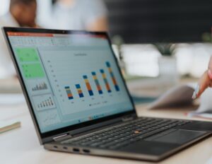 Main utilisant une tablette pour analyser des indicateurs ESG – transition durable numérique.