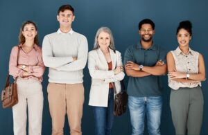 Groupe de professionnels souriants en réunion, illustrant les partenariats privés au service du développement économique des Alpes-Maritimes.