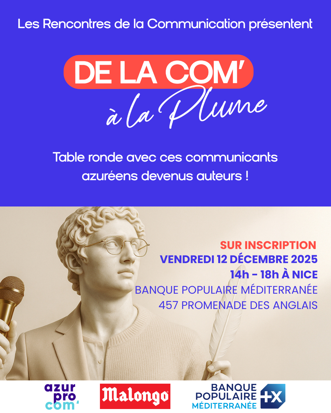 AzurProCom’ vous invite à vous inscrire aux 14èmes Rencontres de la Communication le vendredi 12 décembre 2025 de 14h à 18h au siège social de la Banque Populaire Méditerranée à Nice.