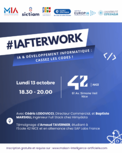 Evénement organisé par Maison de l’Intelligence Artificielle, SICTIAM, Communauté d’Agglomération Sophia Antipolis, CCI Nice Côte d’Azur, Institut EuropIA et Université Côte d’Azur