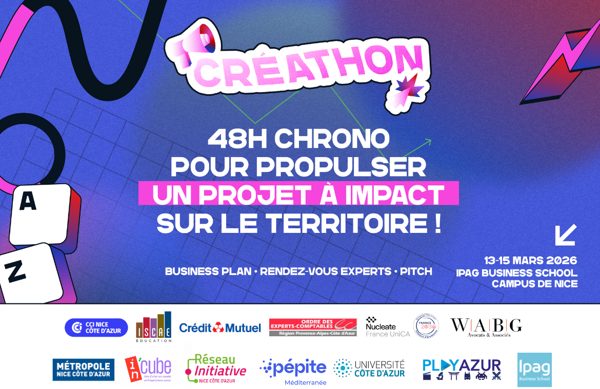 Vous souhaitez donner un coup de boost à votre projet ? Ou vous impliquer dans un projet qui a un impact positif sur le territoire ? Le Créathon est un rendez-vous incontournable qui se tiendra du 13 au 15 mars 2026 à l’IPAG Business School à Nice. Inscrivez-vous !